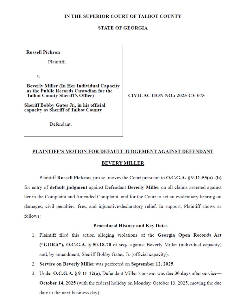 Sheriff’s Office Faces Civil Penalties and Injunctive Orders for Violating Georgia Law TALBOTTON, GA — The fight for open government in Georgia has taken a decisive turn. Georgia Transparency founder Russell Pickron has effectively won his lawsuit against Talbot County Sheriff’s Office records custodian Beverly Miller, after the defendant failed to file any response or defense within the time allowed by law.